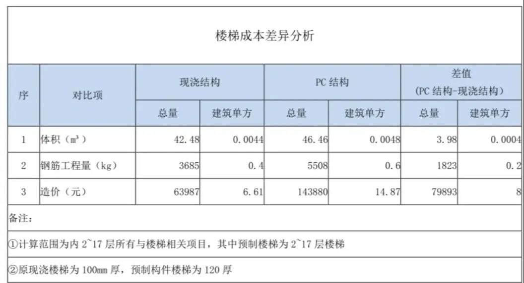 以下以其中某一棟高層住宅為例,依次分析樓梯、樓板、外墻、內(nèi)墻四個部品部件的成本增量。